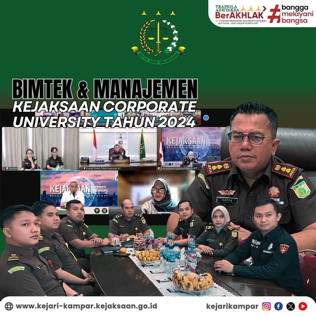 Kepala Kejaksaan Negeri Kampar Bapak Sapta Putra, S.H. M.Hum didampingi Kasubagbin beserta jajaran mengikuti Bimbingan Teknis dan Manajemen (Pembelajaran di Luar Kampus) Kejaksaan Corporate University Tahun 2024 dengan tema Public Speaking dan Strategi Komunikasi secara virtual yang bertempat di Ruang Kerja Kepala Kejaksaan Negeri Kampar.
