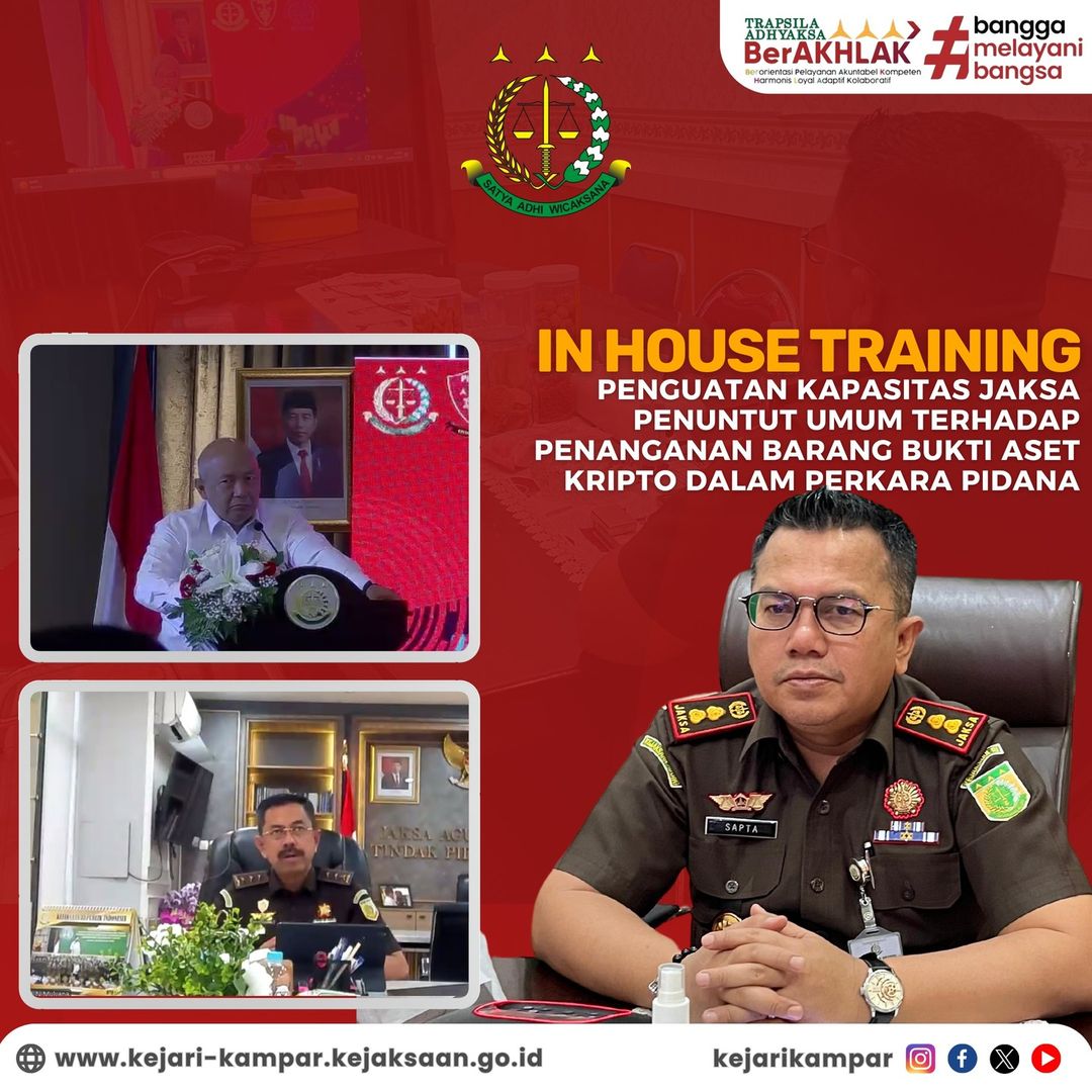 Kepala Kejaksaan Negeri Kampar, Bapak Sapta Putra, S.H.,M.Hum., mengikuti In House Training Penguatan Kapasitas Jaksa Penuntut Umum terhadap Penanganan Barang Bukti Aset Kripto dalam Perkara Pidana secara virtual yang bertempat di Ruang Kerja Kepala Kejaksaan Negeri Kampar.