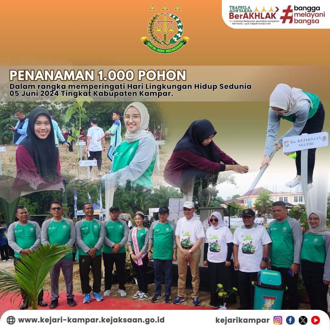 Kepala Kejaksaan Negeri Kampar yang diwakili oleh Jaksa Fungsional pada Seksi Intelijen Kejaksaan Negeri Kampar Ibu Nanda Desvita, S.H. menghadiri kegiatan Penanaman 1.000 Pohon dalam rangka memperingati Hari Lingkungan Hidup Sedunia 05 Juni 2024 Tingkat Kabupaten Kampar, yang dilaksanakan di Kebun Raya Universitas Pahlawan Bangkinang.