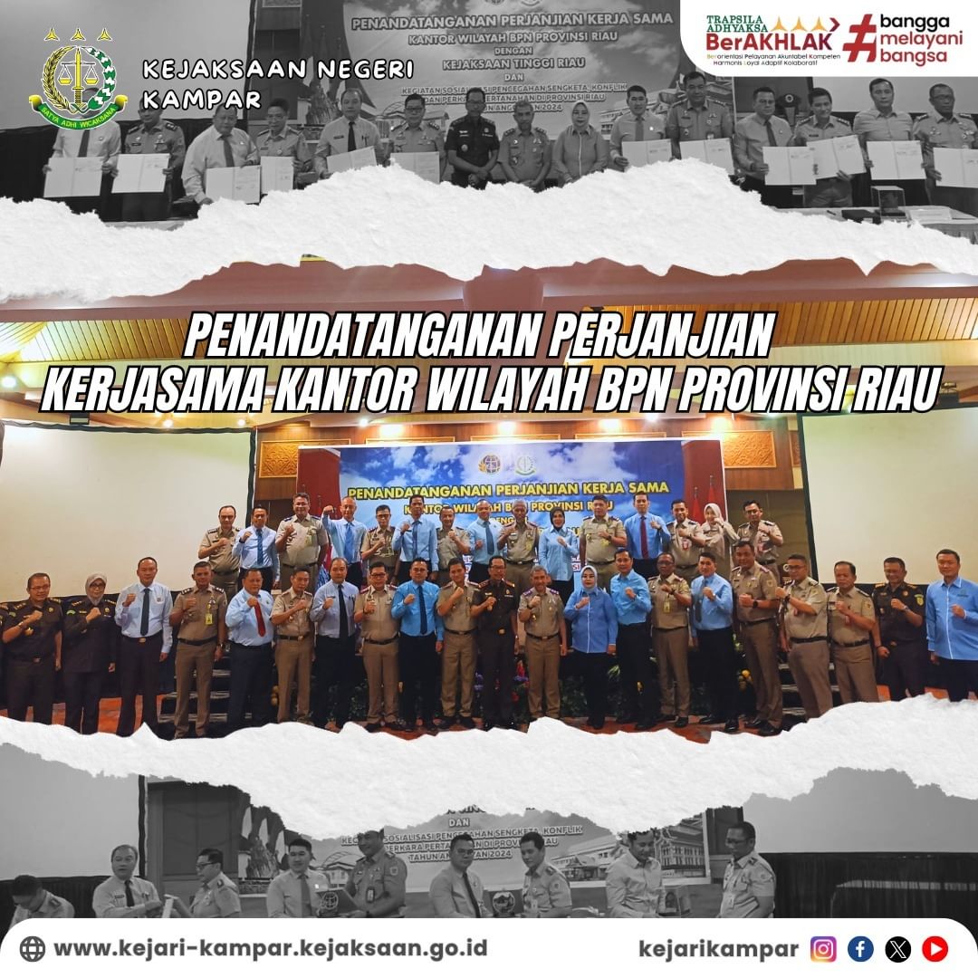 Kepala Kejaksaan Negeri Kampar Bapak Sapta Putra, S.H.,M.Hum. menghadiri kegiatan Penandatanganan Perjanjian Kerja Sama Kantor Wilayah BPN Provinsi Riau dengan Kejaksaan Tinggi Riau dan Kegiatan Sosialisasi Pencegahan Sengketa, Konflik dan Perkara Pertahanan di Provinsi Riau Tahun Anggaran 2024.
