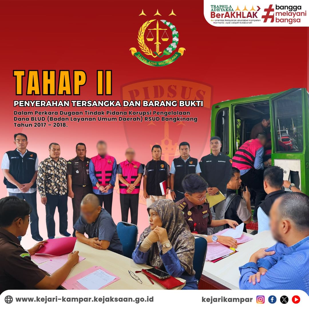 Kepala Seksi Tindak Pidana Khusus Kejaksaan Negeri Kampar, Bapak Marthalius, S.H., M.H., melaksanakan Penyerahan Tersangka dan Barang Bukti (Tahap II) dalam Perkara Dugaan Tindak Pidana Korupsi Pengelolaan Dana BLUD (Badan Layanan Umum Daerah) RSUD Bangkinang Tahun 2017 – 2018 atas nama Tersangka dr. WIRA DHARMA, M.K.M. dan Tersangka dr. ANDRI JUSTIAN, Sp, PD., dari Penyidik Direktorat Reserse Kriminal Khusus Kepolisian Daerah Riau kepada Penuntut Umum pada Kejaksaan Negeri Kampar.