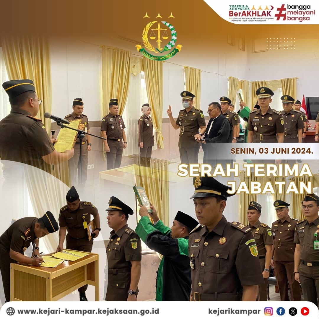 Kepala Kejaksaan Negeri Kampar Bapak Sapta Putra, S.H., M.Hum melaksanakan Pelantikan dan Pengambilan Sumpah Jabatan Pejabat Kepala Seksi Intelijen Kejaksaan Negeri Kampar dari pejabat lama Rendy Winata, S.H., Kepada pejabat baru Jackson Apriyanto Pandiangan, S.H., dan Kepala Seksi Pengelolaan Barang Bukti dan Barang Rampasan Kejaksaan Negeri Kampar dari pejabat lama Rhendy Ahmad Fauzi, S.H., M.H., Kepada pejabat baru Rahmad Hidayat, S.H., yang bertempat di Aula Kejaksaan Negeri Kampar.